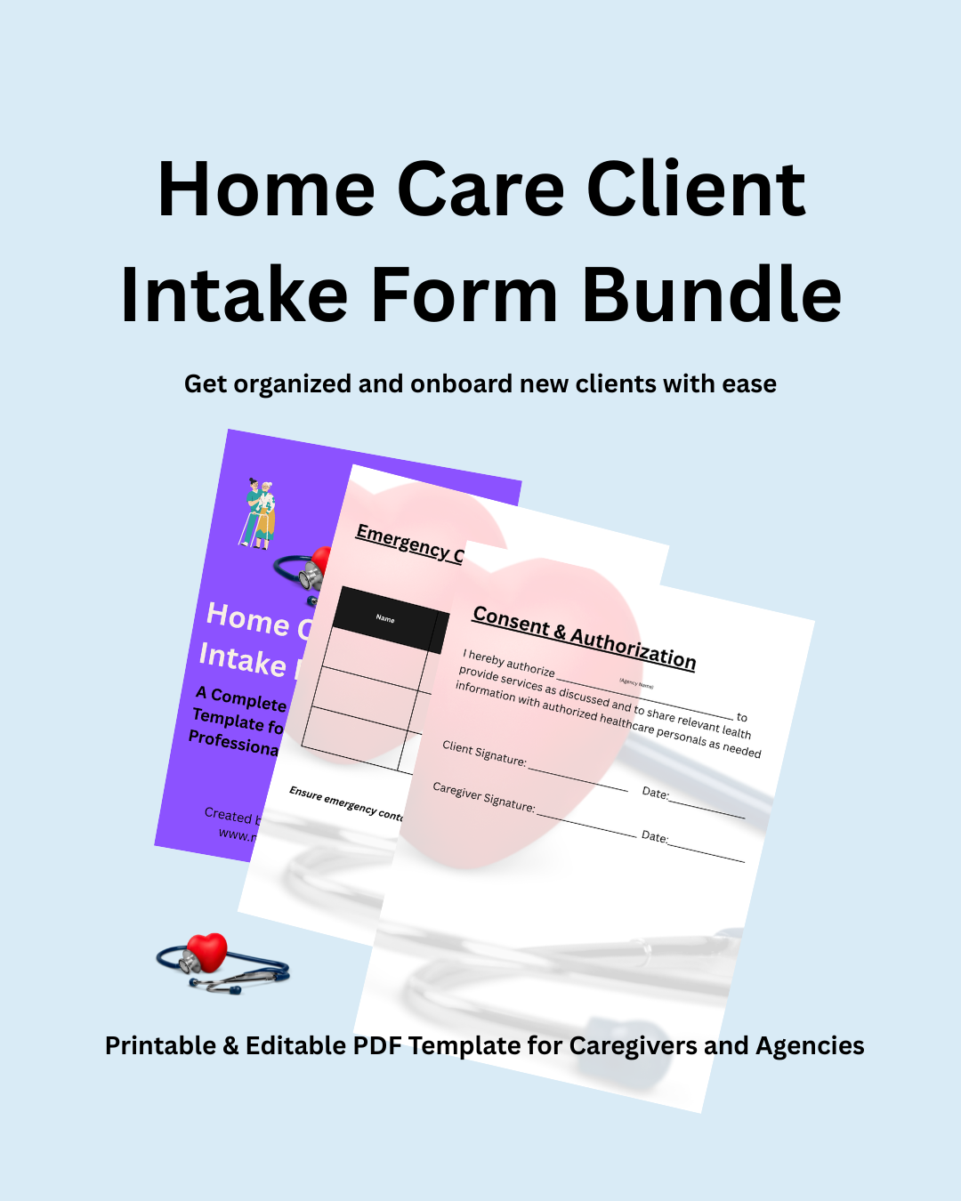 Get organized and onboard new clients with ease. Printable & editable PDF Template for caregivers and agencies with this Home Care Client intake Form Bundle